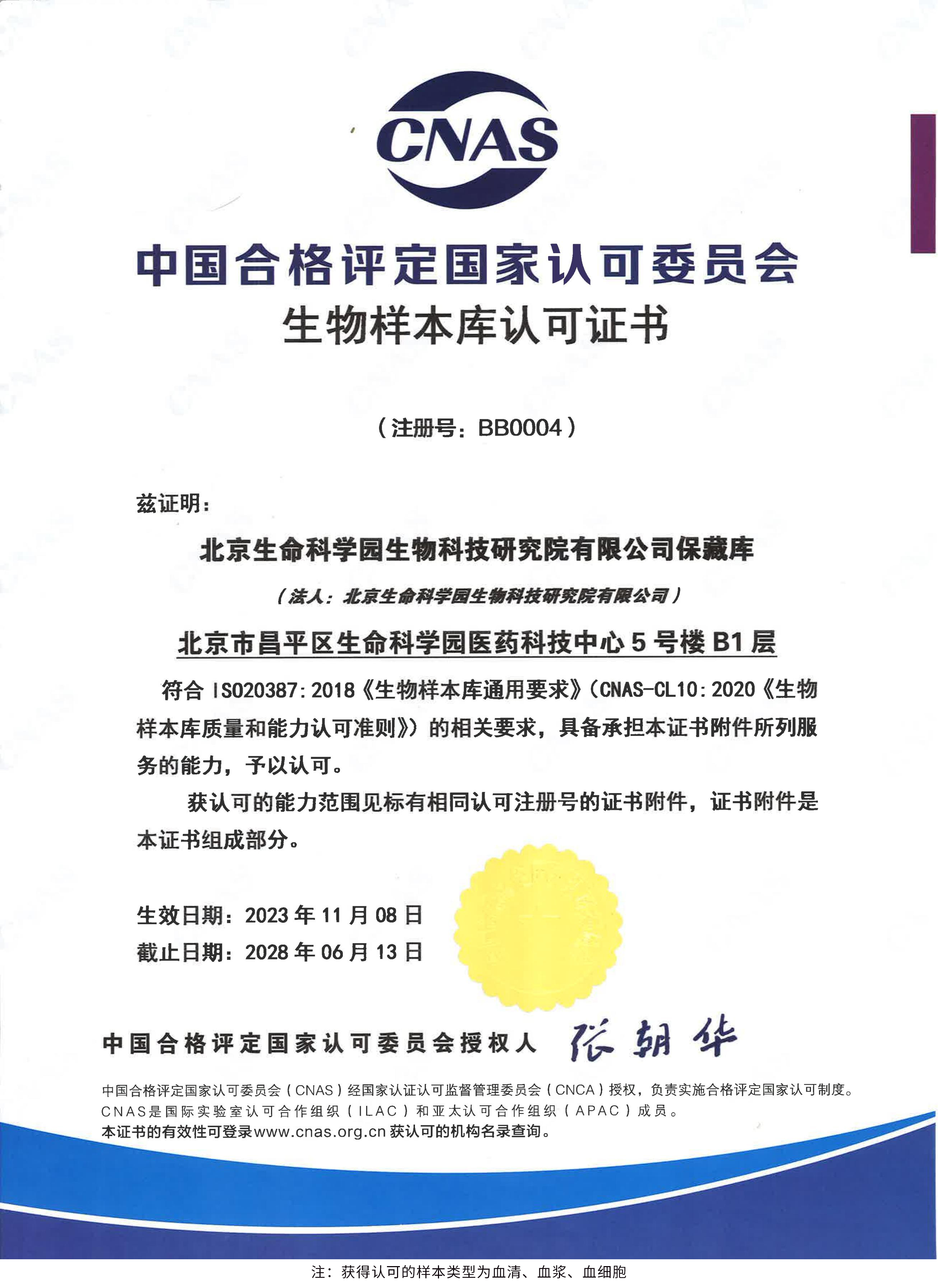 北京生命科學(xué)園生物科技研究院(以下簡稱“北京生物樣本資源庫”)(Biobank of Life Science Park,簡寫“BoLSP”)是一家由北京市科委和中關(guān)村生命科學(xué)園共同支持設(shè)立的第三方生物樣本庫公共服務(wù)平臺,秉承北京重大疾病臨床數(shù)據(jù)和樣本資源庫(以下簡稱“北京庫”)(Beijing Biobank of Clinical Resources,BBCR)十余年的發(fā)展成果,聚合眾多臨床樣本專家的專業(yè)共識,致力于在生命科學(xué)、生物醫(yī)藥研究領(lǐng)域發(fā)揮銜接樣本資源持有者與研究者的橋梁作用,解決生物樣本資源開發(fā)上下游信息不對稱、資源共享困難等問題。研究院在北京中關(guān)村生命科學(xué)園昌平園區(qū)建立了2000㎡生物樣本庫,最大存儲規(guī)模達(dá)1000萬份。研究院遵循CNAS-CL10:2020《生物樣本庫質(zhì)量和能力認(rèn)可準(zhǔn)則》,同時結(jié)合北京庫過去十年的工作經(jīng)驗與教訓(xùn),建立了一套完善的生物樣本保藏質(zhì)量管理體系,從人、機(jī)、料、法、環(huán)、控多個角度,實(shí)現(xiàn)生物樣本保藏過程的全面質(zhì)量控制,先后獲得國家科技部頒發(fā)的人類遺傳資源保藏行政許可證書和中國合格評定國家認(rèn)可委員會(China National Accreditation Service for Conformity Assessment,CNAS)頒發(fā)的“CNAS認(rèn)可證書”。